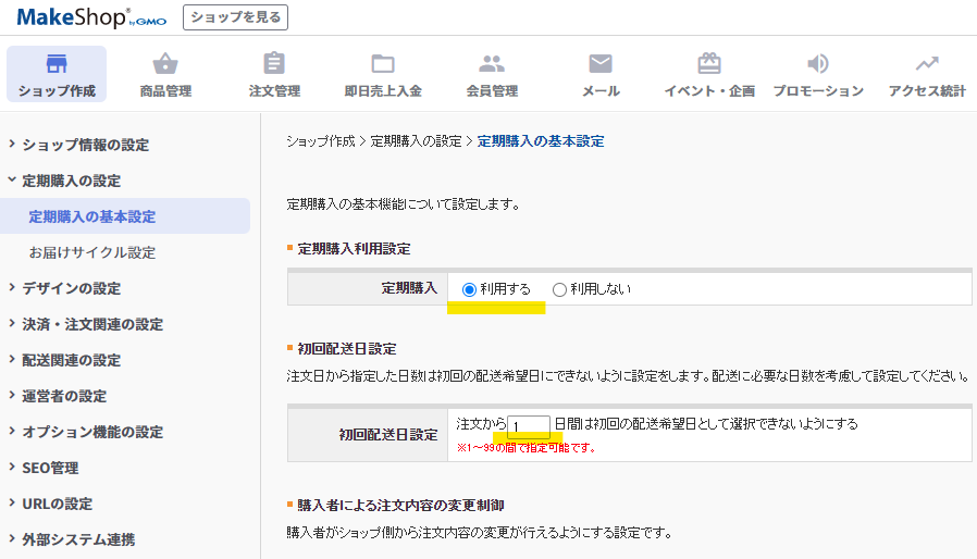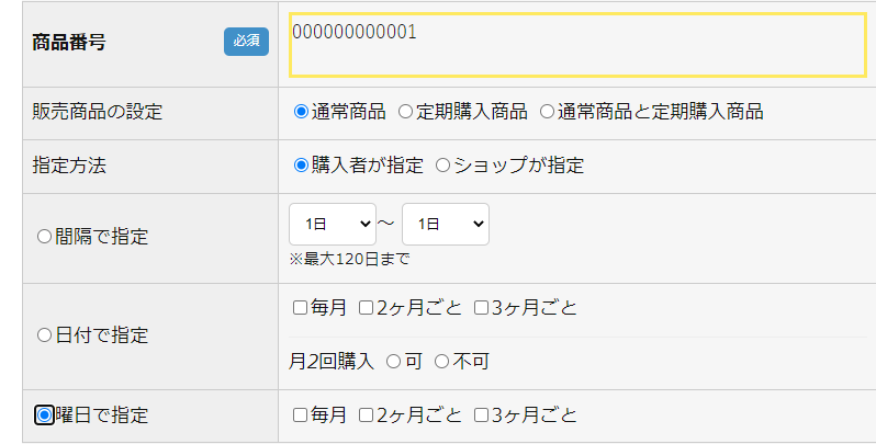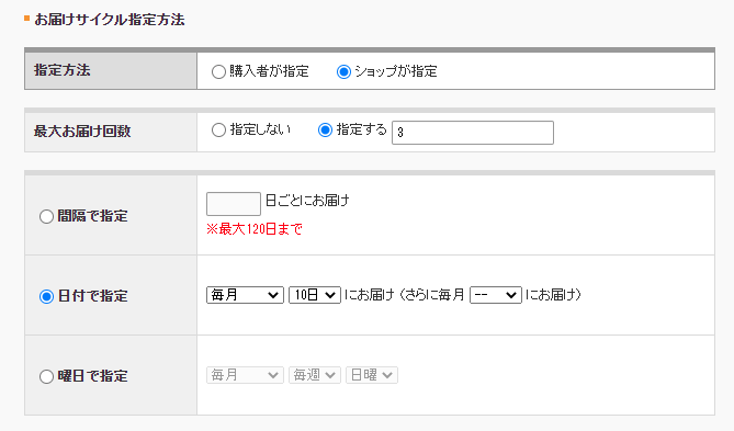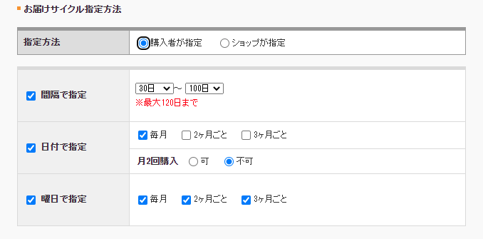 定期購入設定を行う場合、MAKESHOP管理画面「ショップ作成 > 定期購入の設定 > お届けサイクル設定」の、販売商品に指定されている設定内の「お届けサイクル指定方法」と内容を合わせてください。