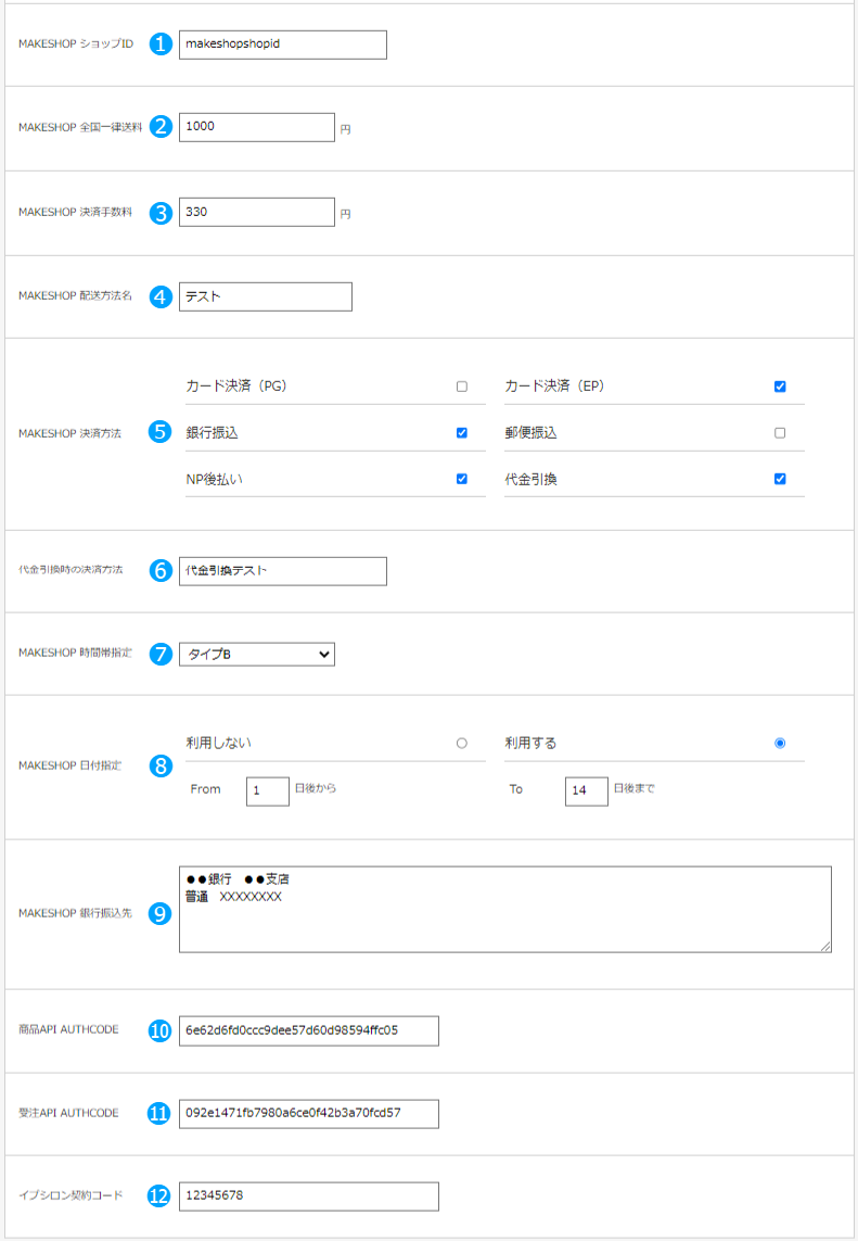 ❼.MAKESHOP管理画面「ショップ作成 > 配送関連の設定 > 配送日時の設定」の「配送希望時間帯の設定」で指定されている内容と同じ内容を入れてください。