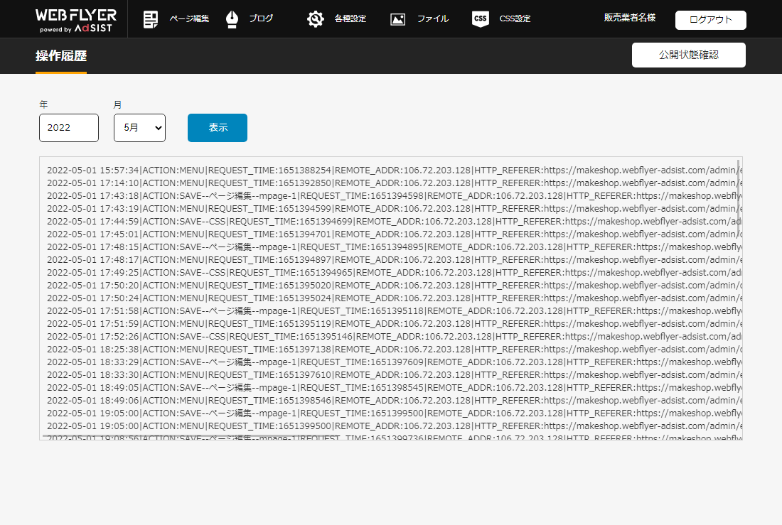 編集者のクライアントIPアドレスや時間、操作内容について記録が閲覧できます。